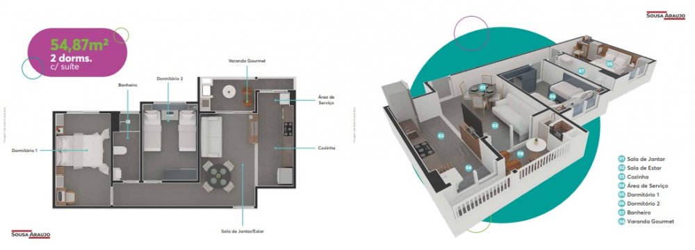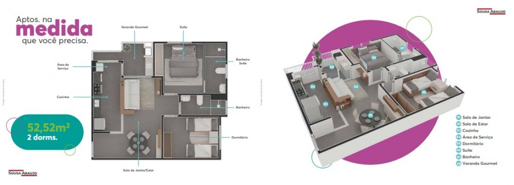 Com 2 dormitórios (sendo com ou sem suíte), Sala, Varanda com churrasqueira, Cozinha, Banheiro e Área de serviços,