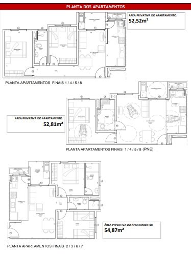 Com unidades de 52,52m², 52,81m² (PNE) e 54,87m².