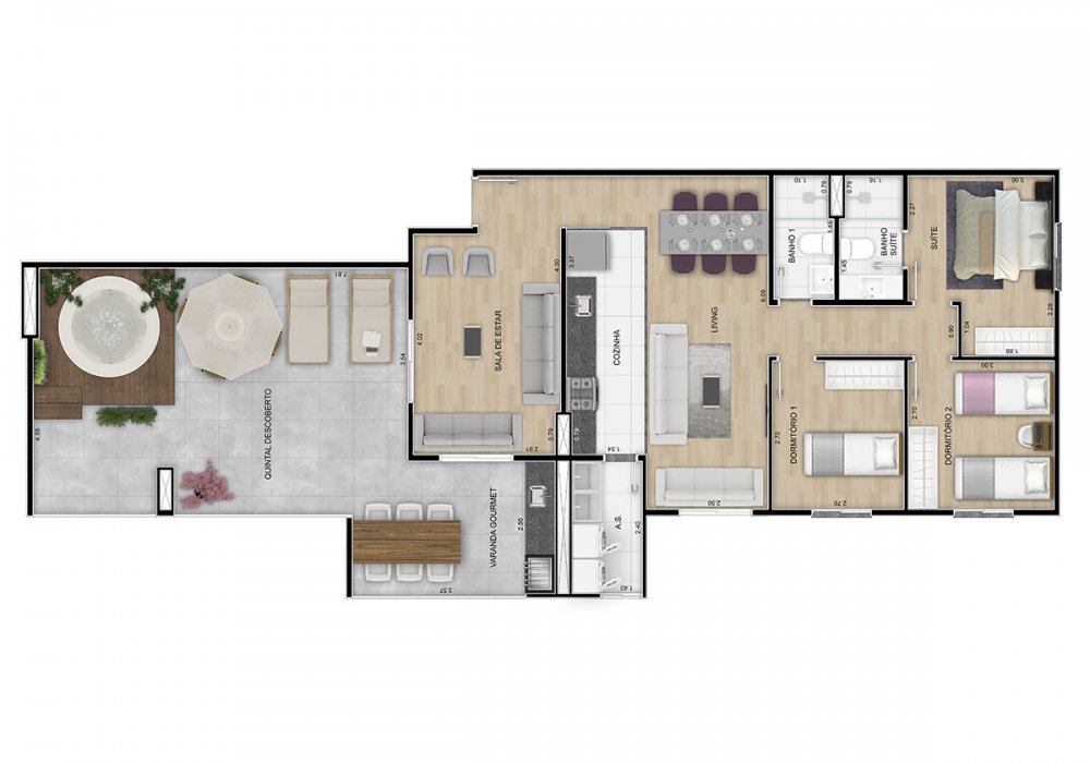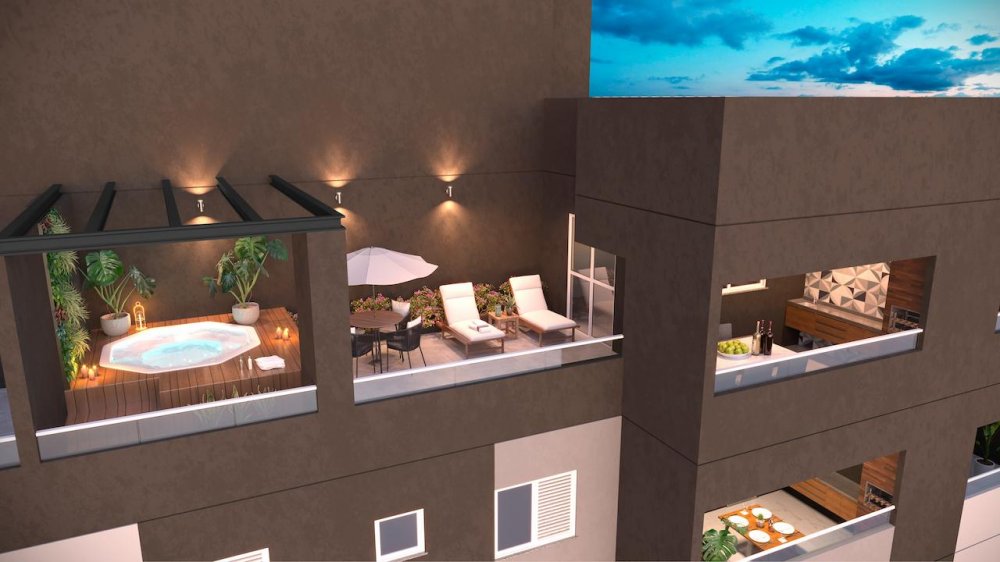 Além das opções de garden e rooftop, possui apartamentos amplos e com varandas espaçosas.