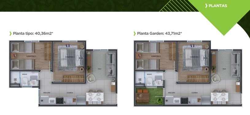 Área privativa das unidades tipo Garden: 43,71m²