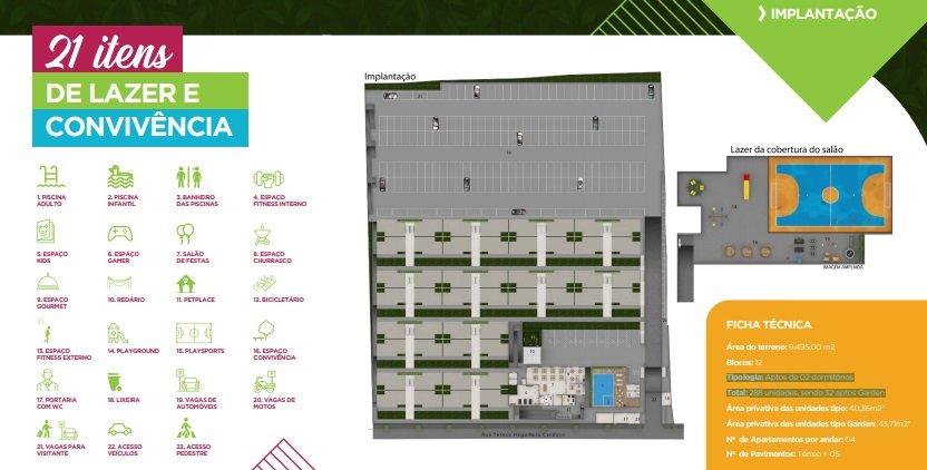 Piscina Adulto e infantil, Espaço Kids, Espaço Gourmet, Redário, Petplace, Bicicletário, Espaço Gamer, Salão de festas, Espaço Churrasco, Espaço Fitness interno e externo, Playground, Playysports, Espaço Conveniência.