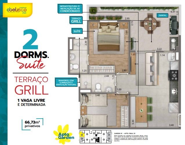 GARDEN 1: 04 unidades: Com 2 Dormitórios (1 suíte) com quintal - 66,73m² privativos (52,89m²+13,84m²) - com 1 vaga.