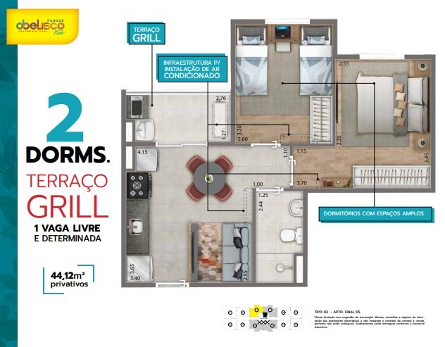 TIPO 3: 55 unidades: Com 2 Dormitórios Terraço grill - 44,12m² privativos - com 1 vaga.