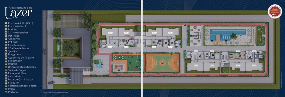 Playground, Salão de festas, Mini mercado, Quadra, Brinquedoteca, Academia, Piscina adulto, Academia ao ar livre, Pet Care, Piscina Infantil, Redário, Solário, Churrasqueiras, Pet Place, Prainha, Salão de Jogos, Praça, Vestiário masculino, Espaço Mulher, Espaço Zen, Vestiário feminino, Lavanderia Compartilhada, Pista de caminhada, Deck,