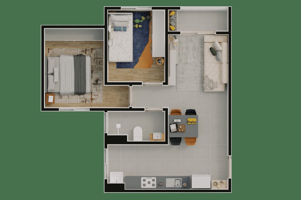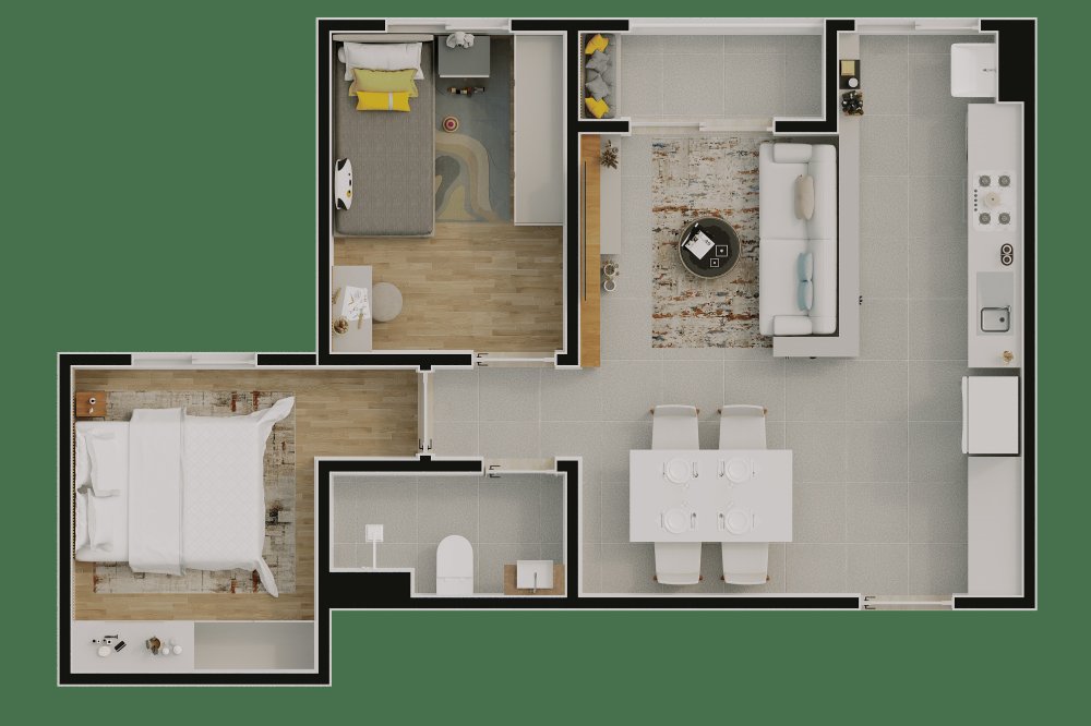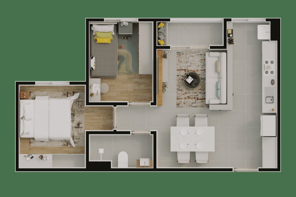 O empreendimento conta com apartamentos que variam de 46,86m² a 48,61m², todos projetados para oferecer o máximo de conforto e funcionalidade.