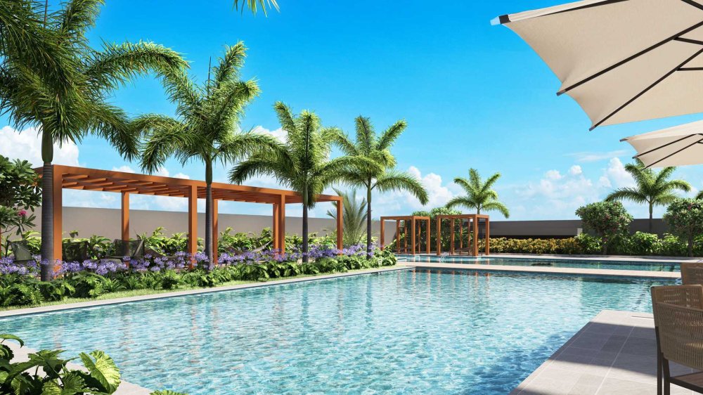 Piscinas adulto e infantil, com deck molhado, bar da piscina e solarium