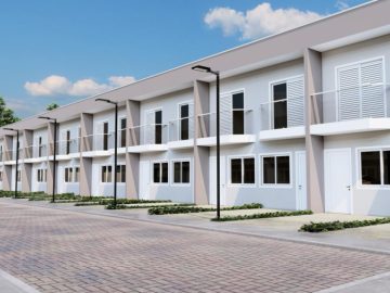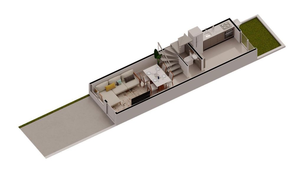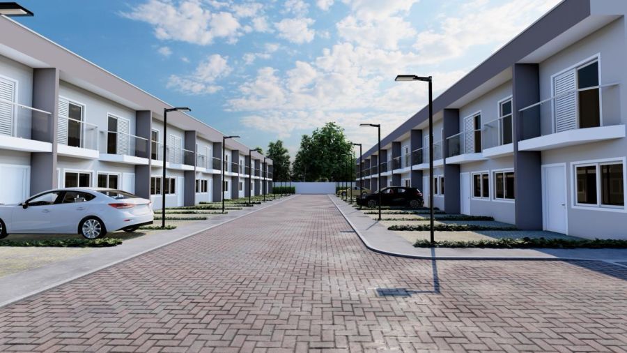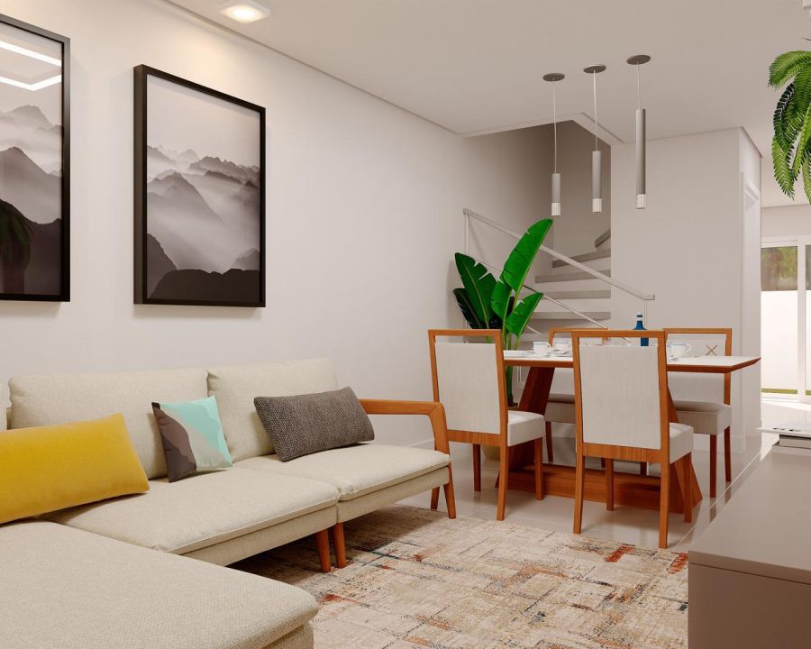 Casas com 79 m2 de área total, dois quartos, sala de estar e jantar, banheiro, lavabo, cozinha com acesso a área externa exclusiva e vaga de garagem na frente da unidade.