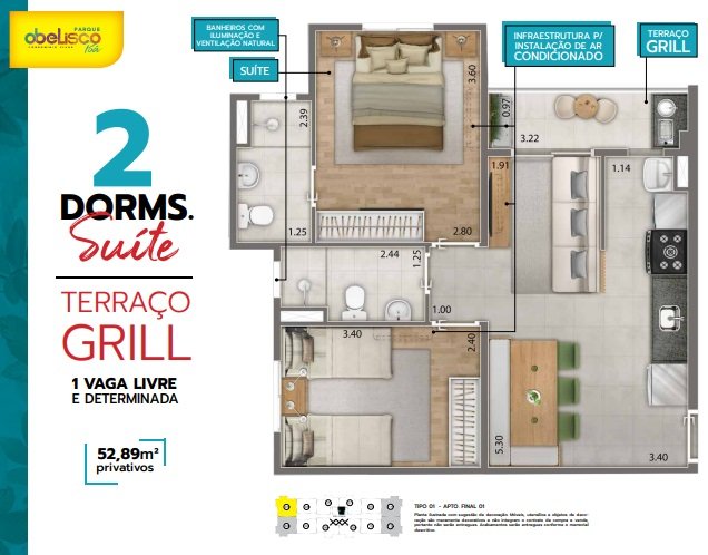 TIPO 2: Com 2 Dormitórios sem terraço - 42,23m² privativos - com 1 vaga.