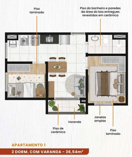 Com 2 dorm. e com varanda - 36,54m²