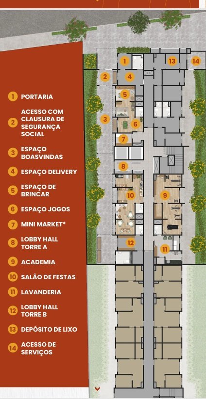 Academia, Espaço Delivery, Espaço Brincar, Lavanderia*, Mini Market*, Salão de Festas, Espaço Jogos, Praça Boas-Vindas.