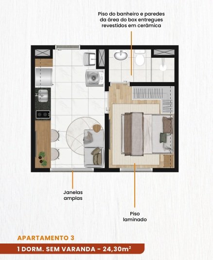 Com 1 dorm. sem varanda - 24,30m²