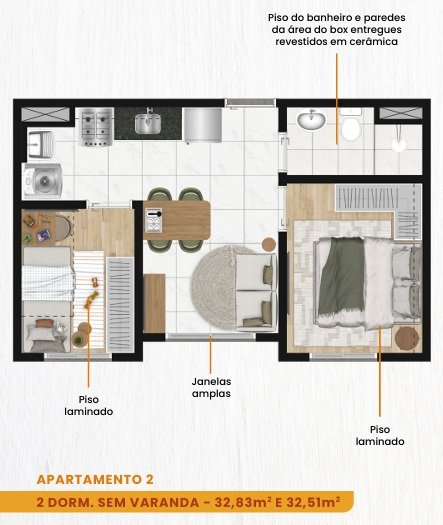 Com 2 dorm. sem varanda - 32,83m² e 32,51m²