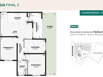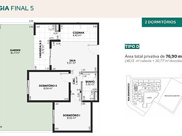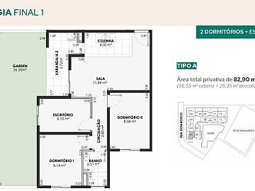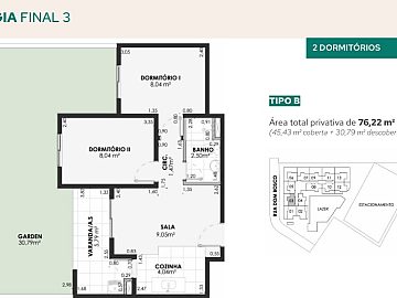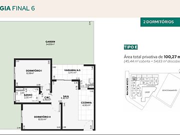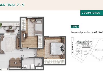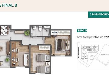 Áreas privativas: 45,43 m² a 57,25 m².