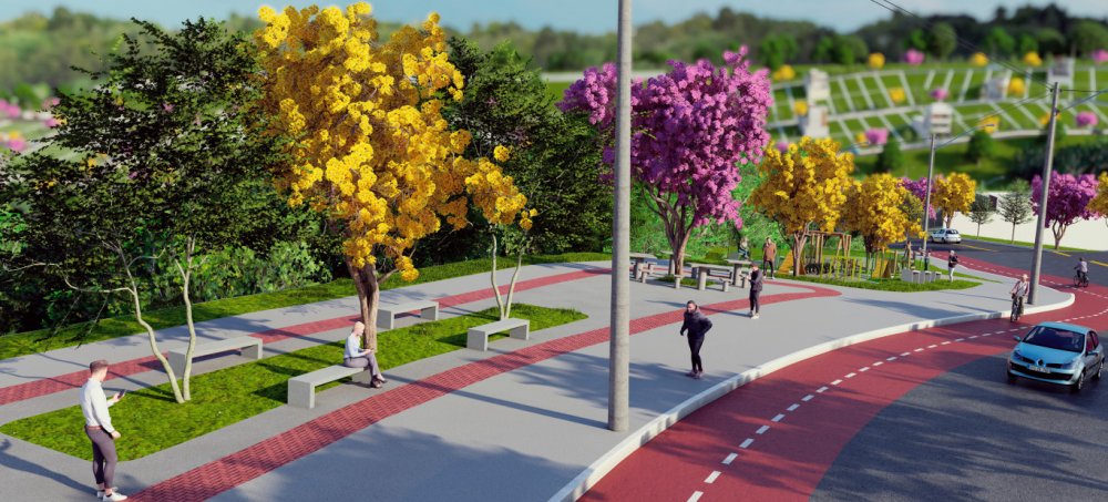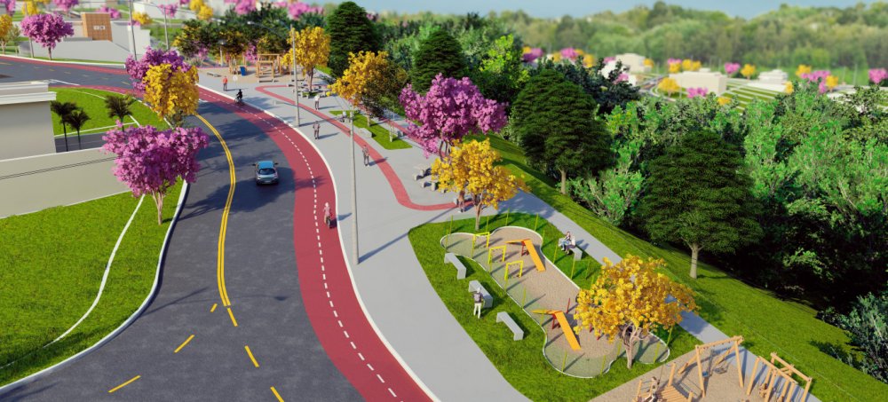 Av. principal com 16m de largura e ciclovia