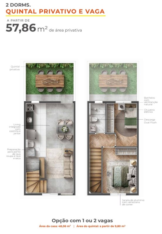 Casas de 2 dormitórios com área privativa de 57,86 m² a 84,46 m²